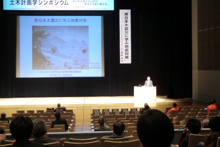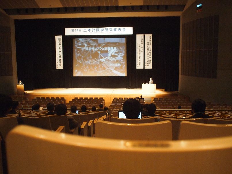 長良川国際会議場で開かれた土木計画学秋大会におきまして、小林潔司教授が土木学会研究業績賞受賞記念の招待講演「想定外リスクと計画理念」を行いました(11/25)。研究業績賞は、原則として、土木学会誌、土木学会論文集、その他土木学会の刊行物に発表した研究、計画、設計、施工、考案などに関する一連の論文等の業績により、土木工学における学術・技術の進歩、体系化に顕著な貢献をなしたと認められる個人に授与されます。